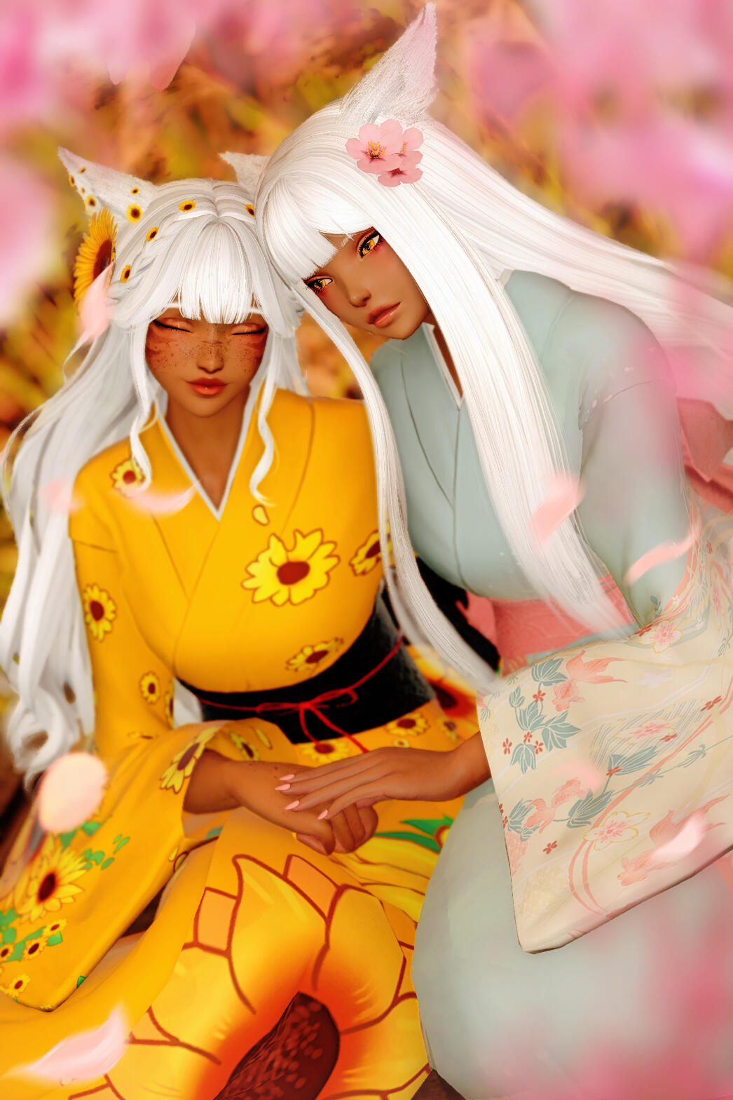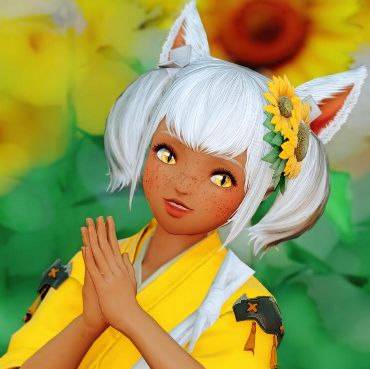 Sol's mother is a renowned Ikebana florist in Kugane, known for her grace, poise, and deep understanding of floral artistry. She runs a well-regarded flower shop, Three Blossoms, lovingly named after her three daughters. This is where she creates arrangements that convey emotion and meaning, believing that flowers speak where words cannot. She's a warm and nurturing mother, encouraging Sol’s creativity and individuality. Her presence is a calming force, embodying elegance and quiet strength, much like the cherry blossoms she holds dear. She wears three cherry blossoms in her hair to symbolize her three daughters Sol, Lunae, and Estella.She passed on her knowledge of Ikebana and fan dance to Sol, encouraging her to express herself while learning discipline and poise.Sunflowers are a deeply sentimental connection for Sol to her mother, who lovingly called her her "little sunflower." As a child, Sol would have heard that phrase often, a gentle reminder from her mother that, like a sunflower, she was a bright and radiant presence in the world. Her mother saw her as a source of joy, much like the vibrant blooms that follow the sun, bringing warmth and light wherever they went.The nickname, "little sunflower," was more than just a term of endearment-- it was a way for her mother to express how she saw Sol’s boundless energy, her innate kindness, and her ability to bring a smile to anyone’s face. Sunflowers, known for their resilience, also symbolize growth and optimism, and Sol's mother used the nickname to remind her that, no matter how tough life became, she had the inner strength to thrive and continue spreading light to others.